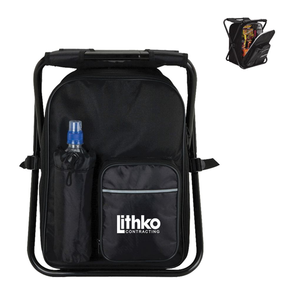 This 24 can capacity cooler has an integrated folding chair. It is made of durable 600D material and features a zippered main compartment with PEVA lining, adjustable padded shoulder straps, zippered front pocket, and a water bottle pocket. Suggested max weight for chair is 300 lbs. Folds flat for easy storage.