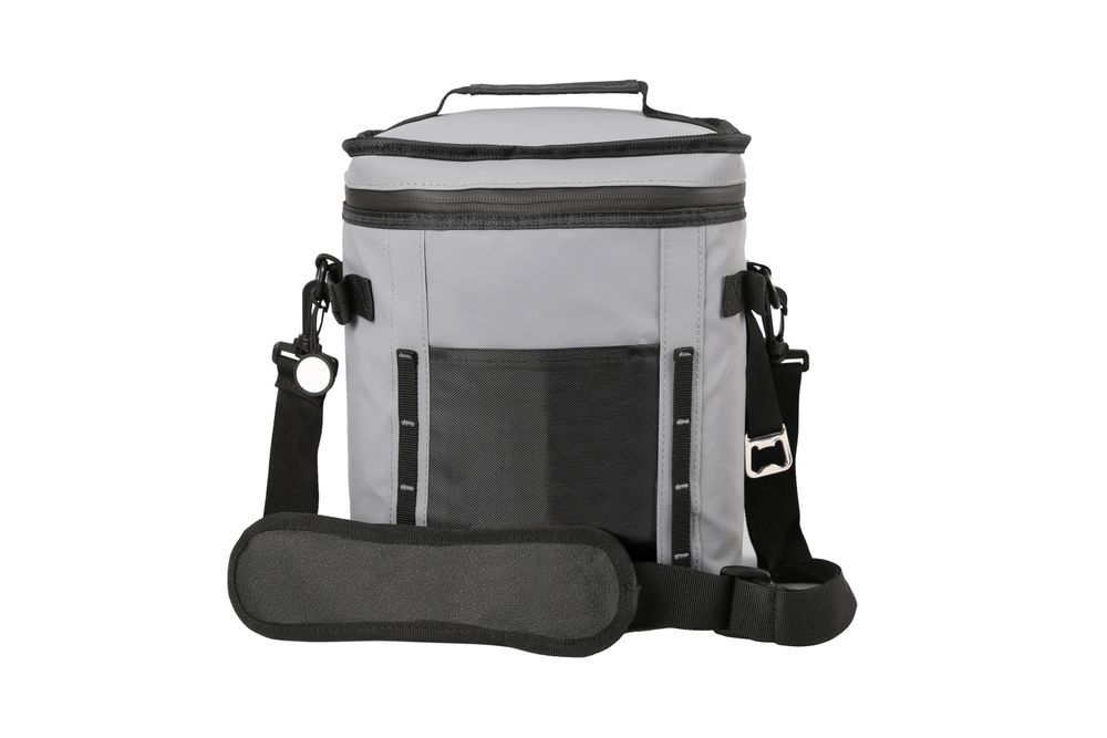 This Tarpaulin insulated cooler bag is built to last. It's water resistant & has padded PE foam insulation to ensure contents stay cold with the use of an ice pack. The main pocket is accessible with a 3 side zipper with top & side carrying handles. The front slash pocket & loop stitched straps allows even more contents on the outside. An attached bottle opener hangs off the side strapping. Holds up to 12 cans, has an adjustable/removable shoulder strap, and makes the perfect Picnic Cooler. 9" W x 11" H