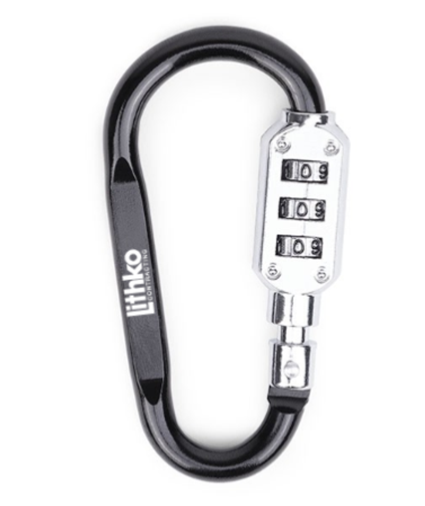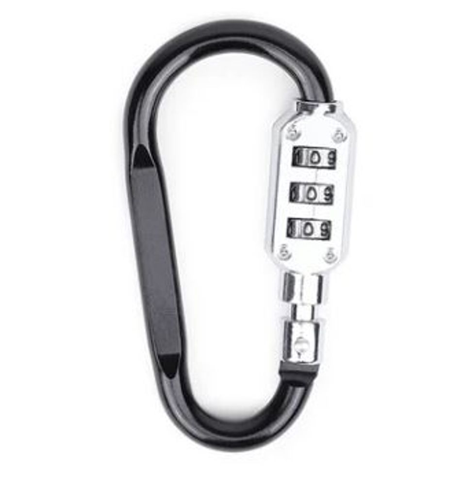 Lightweight aluminum and zinc alloy carabiner keychain with a secure password lock. Compact at 3"x1" and 0.10 lb, ideal for on-the-go safety. 3" W x 1" H